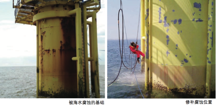 避免腐蝕的另一種常用方法是在鋼結(jié)構(gòu)表面施以由環(huán)氧樹脂構(gòu)成的防腐涂層來隔絕海水。目前,海上風(fēng)電的防腐常將這兩種方法結(jié)合起來,在涂料中加入大量鋅粉或鋁粉,成為犧牲陽極。一旦涂層的阻隔作用削弱,就用犧牲陽極來保護(hù)。