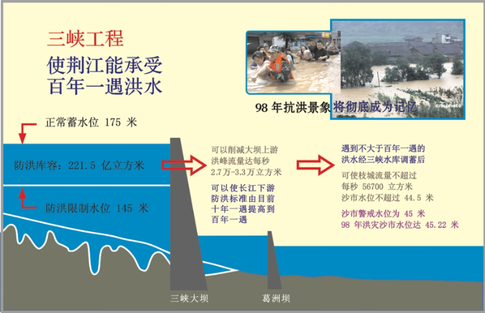 如果沒有三峽工程,荊江河段若遭遇類似歷史上出現(xiàn)過的1860、1870年特大洪水,兩岸堤防將潰決,洪水直趨洞庭湖,淹沒江漢平原,直接危及武漢市和京廣鐵路的安全,沖毀沿線鄉(xiāng)村、城鎮(zhèn)和工礦企業(yè),勢必造成大量人員傷亡和巨大經(jīng)濟損失。為了消除中華民族的心腹大患,因此將防洪功能作為三峽工程的首要功能。