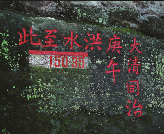 此題刻為云陽縣令所刻,后經(jīng)長江委歷史洪水調(diào)查時測定并補刻洪水高程“150.35”)